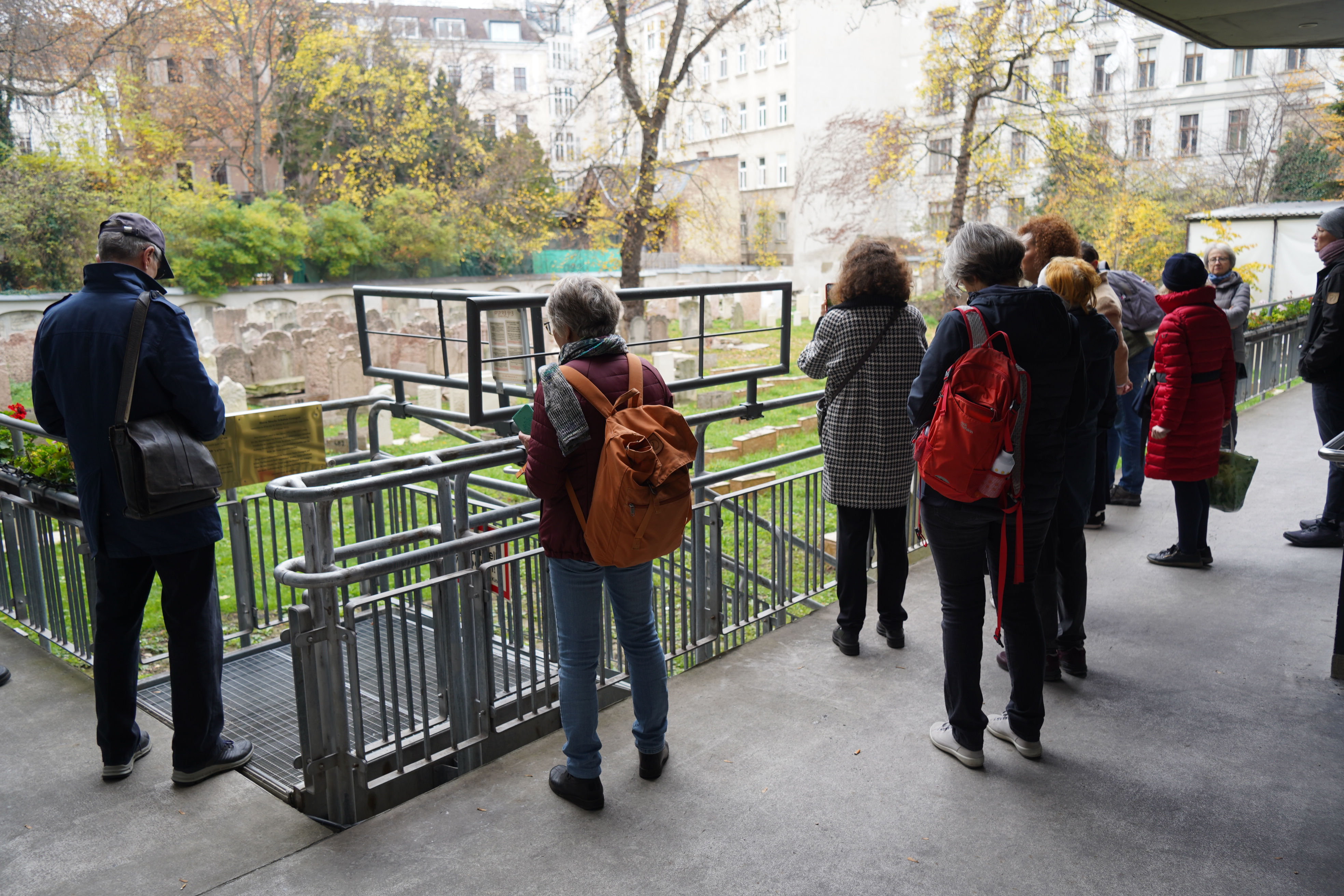 Danach gedachten wir bei der ehemaligen Synagoge in der Müllnergasse 21 den Opfern der Novemberpogrome und besuchten den ersten Gedenkstein im 9. Bezirk in der Porzellangasse. Die vorletzte Station führte uns in den Innenhof des Pensionist:innenheimes „Häuser zum Leben“ Rossau, wo sich ein alter jüdischer Friedhof befindet. Der Friedhof ist der älteste erhaltene jüdische Friedhof Wiens.