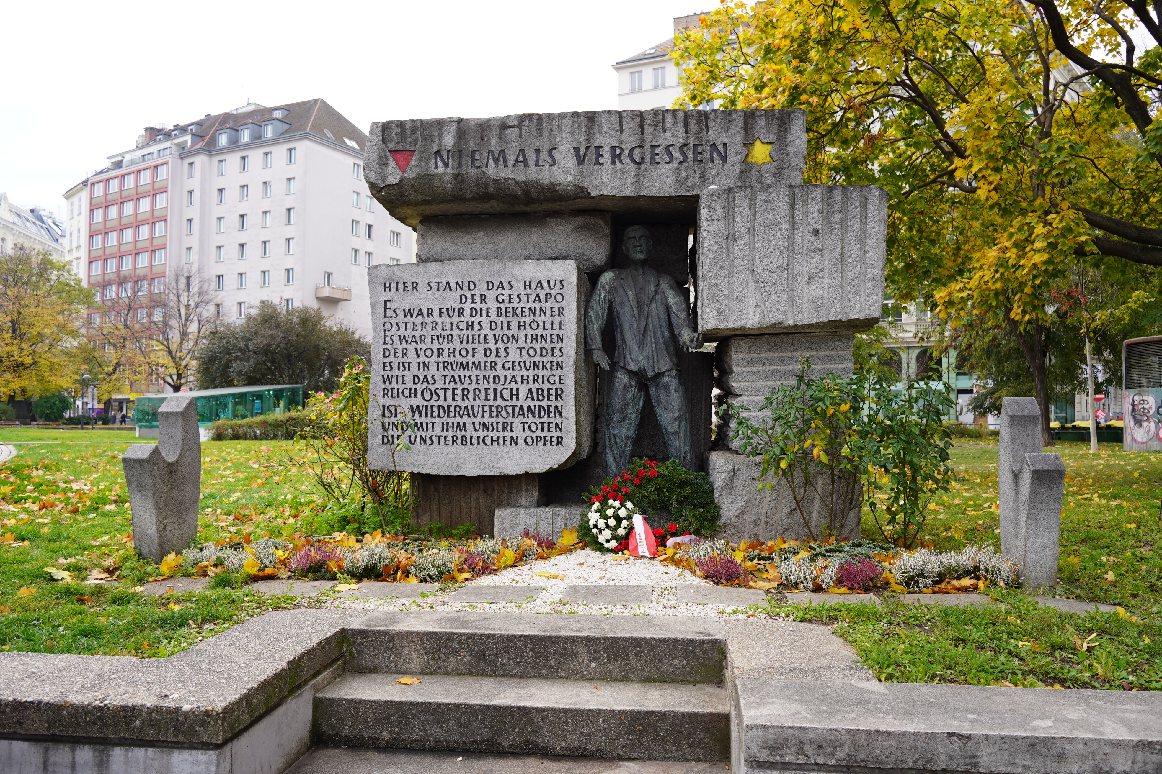 Gestartet haben wir unseren Spaziergang am Morzinplatz vor dem Denkmal der Opfer des Faschismus. Ein Denkmal, das, wie einige andere Denkmäler in Wien, erst illegal errichtet wurde und erst später – nachdem es professionell gestaltet worden war – legal und dauerhaft erbaut wurde. Es dokumentiert damit auch das stete Ringen um Geschichte und Gedenken in Österreich seit 1945.
