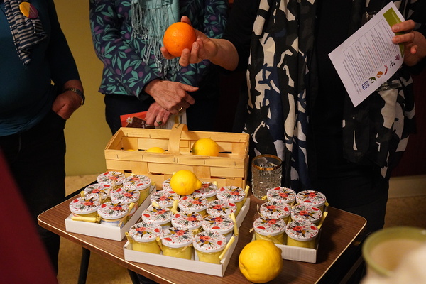 Nach einer kleinen Pause zur Stärkung bauten wir einen Mini-Marktplatz mit "Good Practise Beispielen" auf. Wir hörten vom Projekt "Energy with Spirit", das einen Beitrag leistet, um die Herausforderungen der Energiekrise zu bewältigen, indem vulnerable Bevölkerungsgruppen in die Energiewende einbezogen werden (Stichwort: Solidarische Energiegemeinschaften). Verkostet werden konnten Zitrusfrüchte, die bei einer Kleinbauernfamilie in Sizilien in großer Menge zu fairen Preisen gekauft und unter Gemeindemitgliedern in Wien Neubau verteilt werden. So können die Kosten für den Transport aufgeteilt werden und die Konsument:innen wissen genau, wo ihre Zitronen herkommen. Abgesehen davon ist die Qualität ganz anders als bei im Supermarkt gekauften Früchten. Außerdem erfuhren wir, dass sich alte Jeans hervorragend zur Herstellung von Dämmstoff eignen (mehr Infos hier).