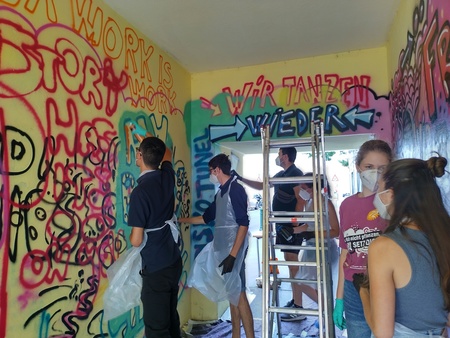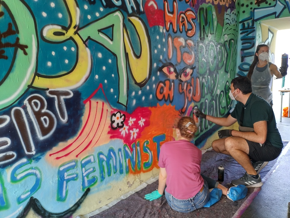 Sag's auf Graffiti: junge Menschen sprayen den Durchgang mit ihren Messages direkt beim Albert Schweitzer Haus (September 2021)